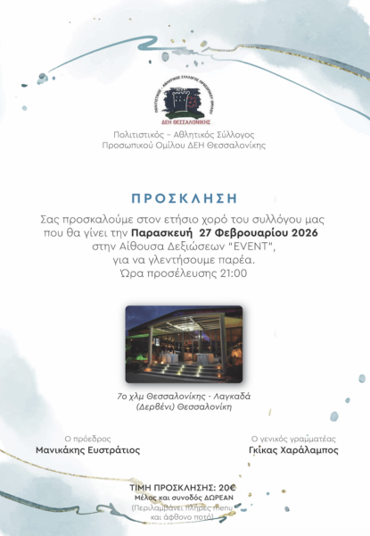 Ο Πολιτιστικός Αθλητικός Σύλλογος Πρ. Ομίλου ΔΕΗ Θεσσαλονίκης σας προσκαλεί στον ετήσιο χορό του την Παρασκευή 27 Φεβρουαρίου 2026 και ώρα 21:00, στην αίθουσα δεξιώσεων Event, 7ο χλμ Θεσσαλονίκης – Λαγκαδά (Δερβένι) Θεσσαλονίκη.